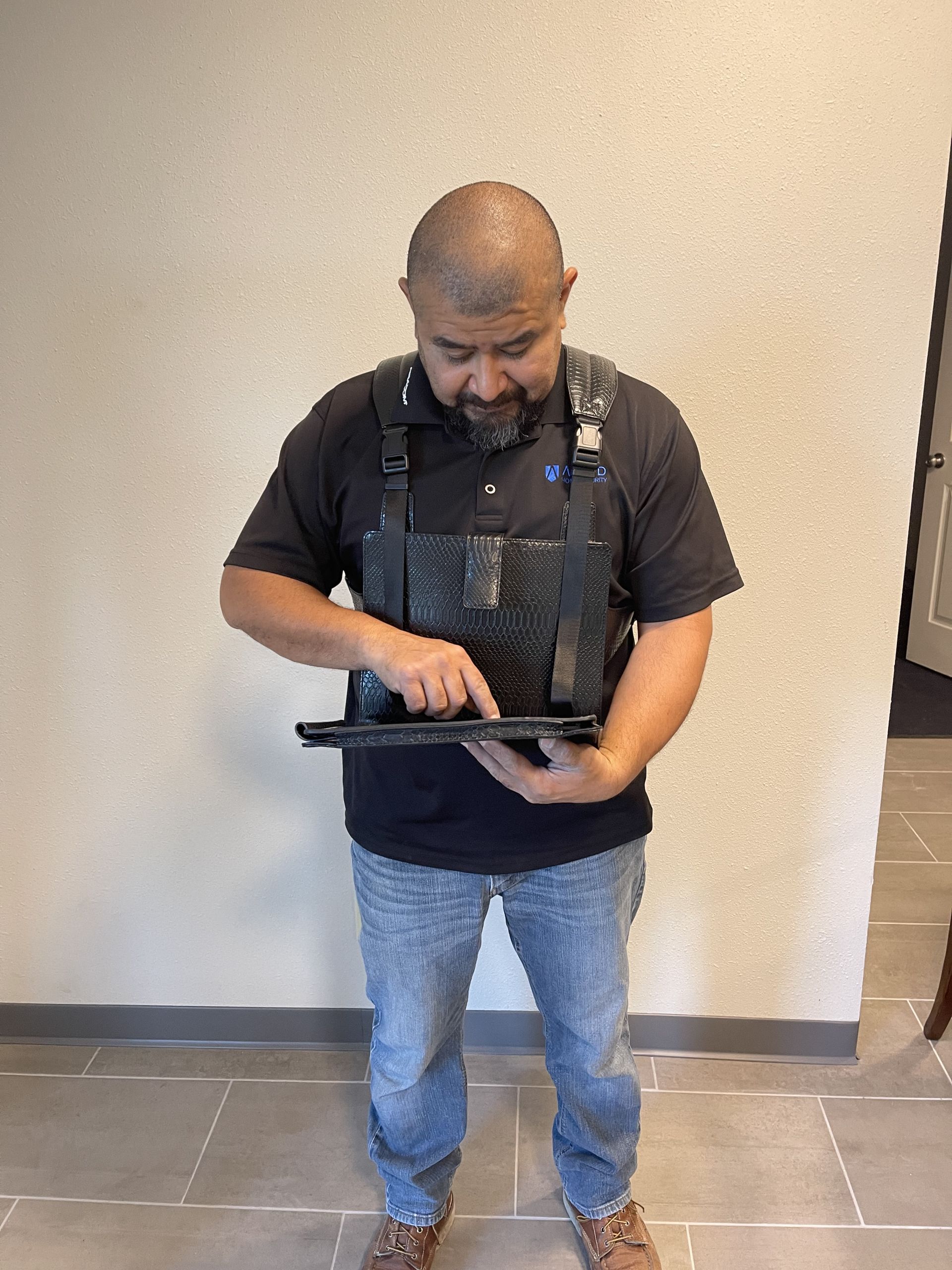 It’s a carrier for a l-Pad or any Tablet computer.. It’s hand free, you wear it on your chest. It folds like a book and snaps together. When you are ready to use it, unsnap it and fold down. It’s hands free. Make for children and adults. Here is a sample below.